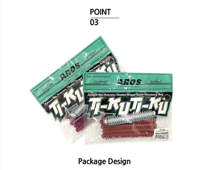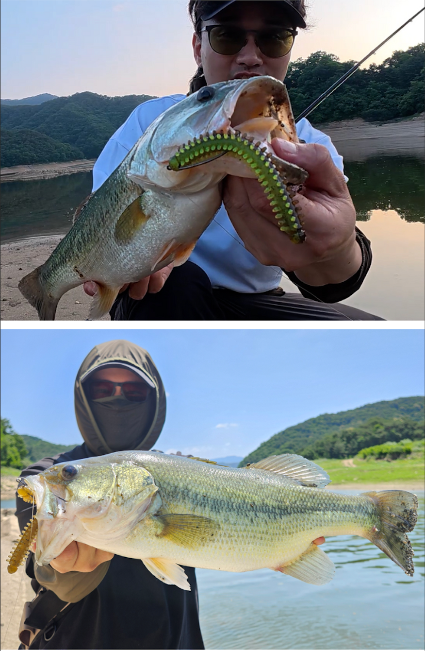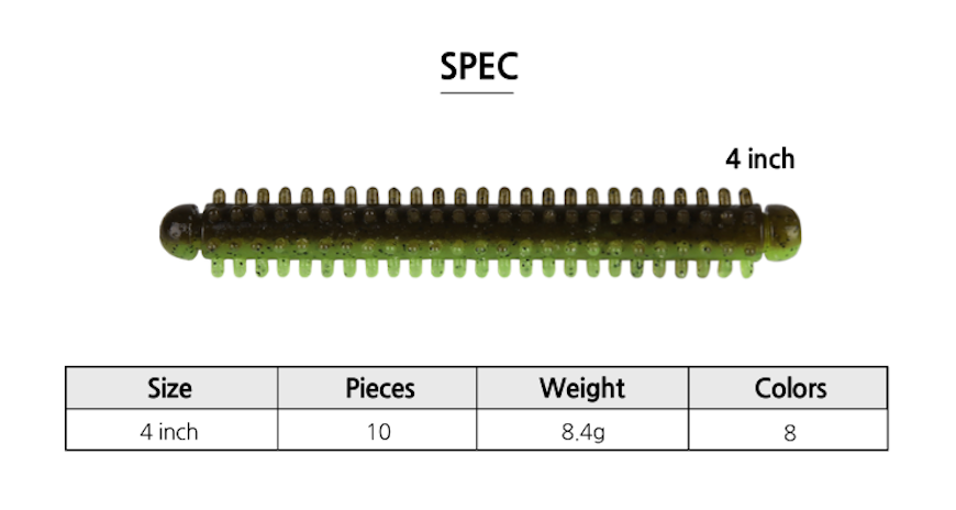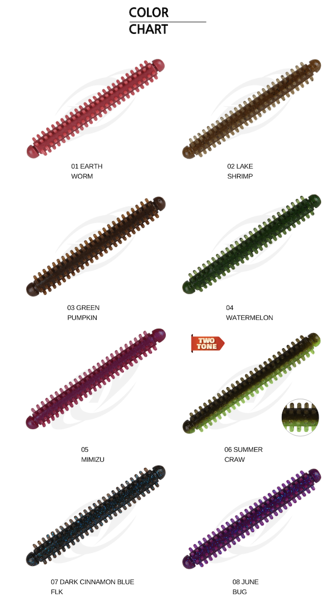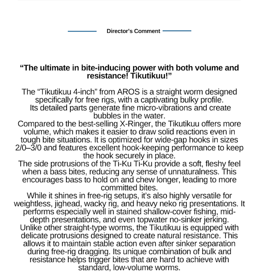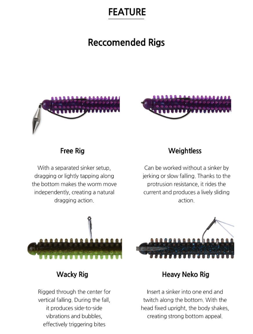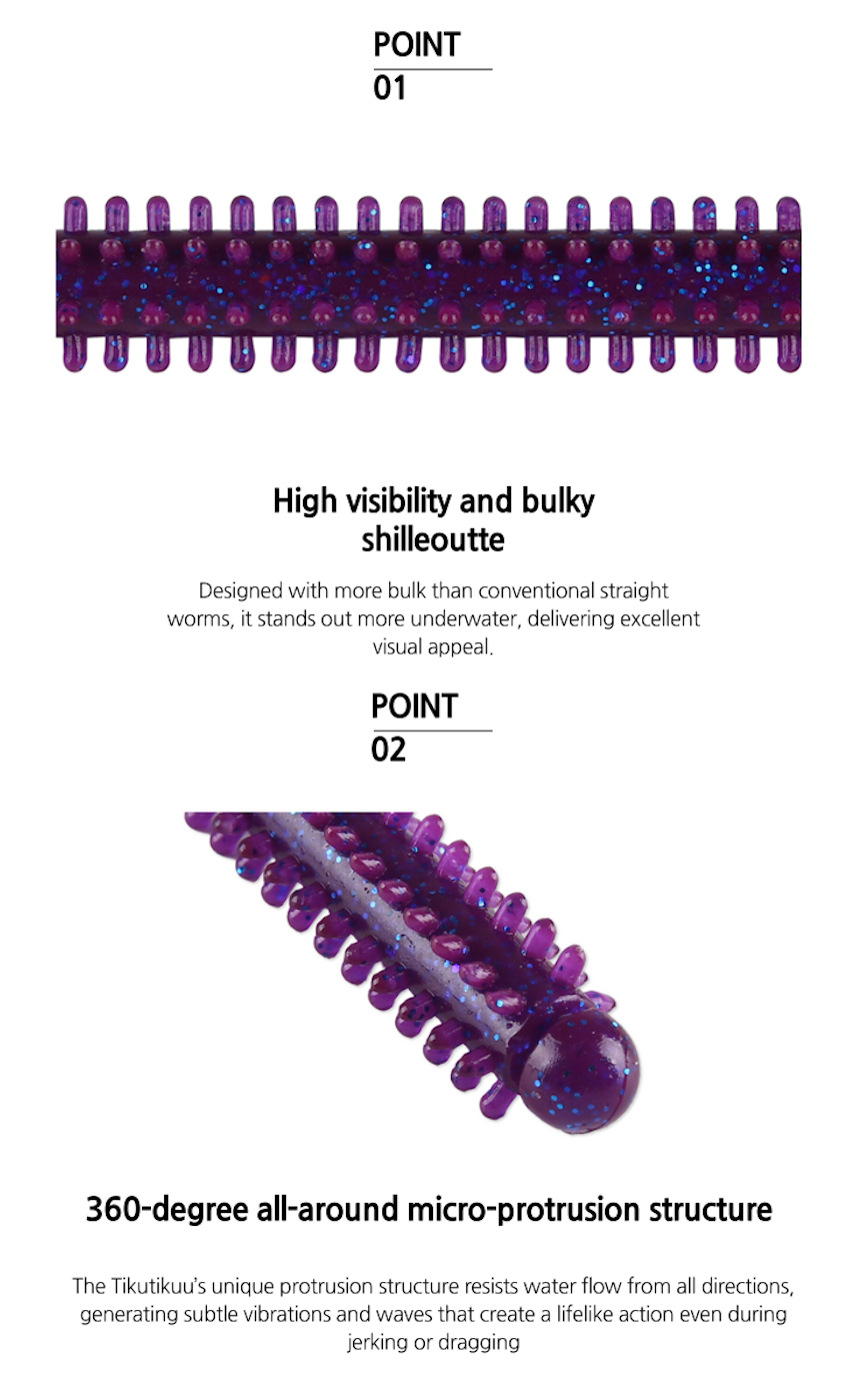 Unlike other straight-type worms, the Ti-ku Ti-ku is equipped with delicate protrusions designed to create natural resistance. This allows it to maintain stable action even after sinker separation during free-rig dragging. Its unique combination of bulk and resistance helps trigger bites that are hard to achieve with standard, low-volume worms.